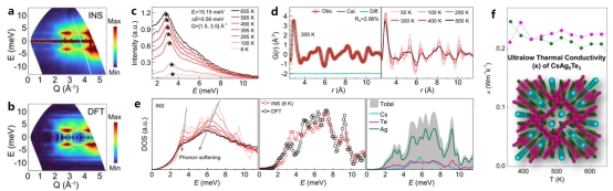近日,中国科学院高能物理研究所中国散裂中子源(CSNS)谱仪数据分析团队与合作者利用中子散射实验技术以及理论计算探究了热电材料CsAg5Te3的结构和声子动力学,解释了该有序晶体的异常低热导机制,成果以《Strong low-energy rattling modes enabled liquid-like ultralow thermal conductivity in a well-ordered solid》为题发表在国内高水平期刊《国家科学评论》(National Science Review)上。
