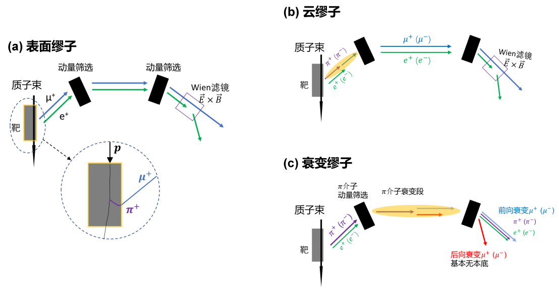 根据π介子衰变的位置的不同,产生的缪子束流可以分为3类:表面缪子(Surface muon,只有带正电荷的μ+),衰变缪子(Decay muon,可以是μ+,也可以是μ−)和云缪子(Cloud muon,可以是μ+,也可以是μ−),如图1所示。