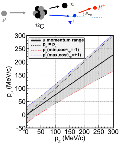 图2 衰变缪子动量(纵轴)与π介子动量(横轴)的关系。其中,灰色阴影区域代表缪子动量范围,黑色虚线代表缪子动量等于π介子动量,红色虚线代表衰变缪子的最小动量(朝正后方衰变),蓝色虚线代表衰变缪子的最大动量(朝正前方衰变)