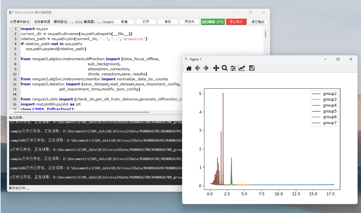 数据处理关键的一环是将原始的中子事例数据进行一系列物理转换,并修正外部环境以及中子对样品的影响因素,最终得到只反应样品本征属性的用户数据。整过过程需要修正中子能量分布、背底散射、探测器效率、重力等因素引起的散射信号的变化。RZera是CSNS数据分析团队自主研发的国产化中子数据分析软件: